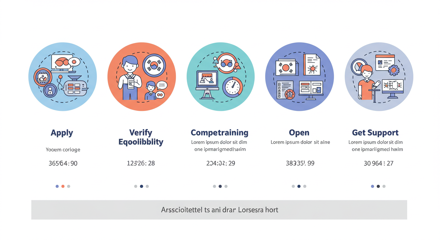 - ① 신청 접수 → ② 자격 심사 → ③ 교육 이수 → ④ 계좌 개설 → ⑤ 정부 지원 적립 개시
